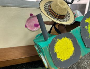 This week, we made our own tractor out of cartoon, painted it and drove around with.