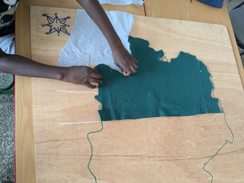 The north of Germany is flat. The children represent this with felt fabric. The low mountain ranges of Germany are represented by egg cartons. Blue plastic bags are used to represent the North and Baltic Seas. The map grows and grows.