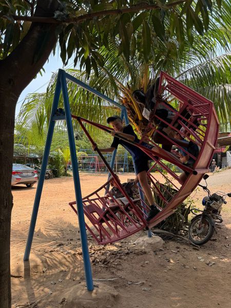 At midday, we returned to the hotel for lunch. Afterwards, we wrote down our wishes and things we are grateful for on small pieces of paper and folded them into paper boats. We then went for a walk to the Volta River to let the boats float, but suddenly a thunderstorm surprised us! We got completely soaked and took shelter in another hotel until the rain stopped – it was quite an adventure! When we got back, we all jumped into the pool. Tonight, after dinner, there will be a karaoke party!