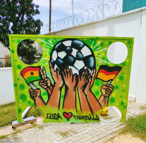 The well-known Ghanaian graffiti artist Scrapa visited the students in Year 5/6 as part of an art project. They had been studying street art and graffiti in class. Scrapa explained the different types of tags and categorized graffiti culturally. Of course, the fifth and sixth graders were then allowed to use the spray cans themselves before the artist redesigned the goal wall based on suggested motifs.