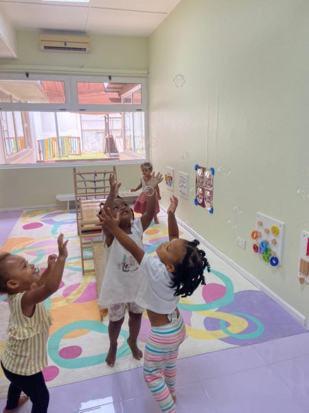Vergangene Woche haben wir in der Kinderkrippe Seifenblasen platzen lassen und waren begeistert davon, wie die Blasen in der Luft fliegen. Wir haben auch Luftballons mit Salz und Mehl befüllt. Dadurch konnten die Kinder ihre Feinmotorik trainieren und es machte großen Spaß den Ball anschließend zu kneten! Der Tanz zu „1, 2, 3 im Sauseschritt“ hat allen viel Freude bereitet und es machte großen Spaß die Choreographie dazu zu lernen. Natürlich war neben unseren Aktivitäten auch reichlich Zeit zum Spielen und zum Entdecken!