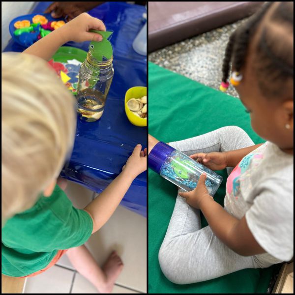 Passend zum Thema Wasser, haben die Kinder in der Krippe Sensorik-Wasserflaschen mit Fischen, Muscheln und Glitzer hergestellt.