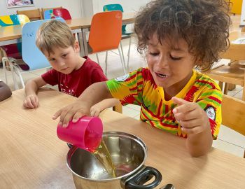 Diese Woche haben wir verschiedene Farben erkundet. Wir haben unsere Hände in Regenbogenfarben bemalt. Außerdem haben wir Lieder über einen Regenbogen gesungen.