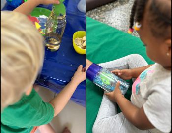 Passend zum Thema Wasser, haben die Kinder in der Krippe Sensorik-Wasserflaschen mit Fischen, Muscheln und Glitzer hergestellt.