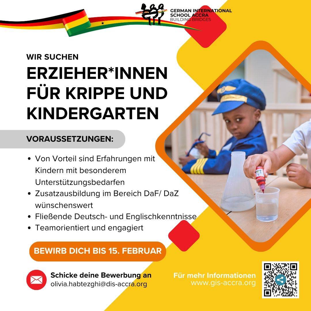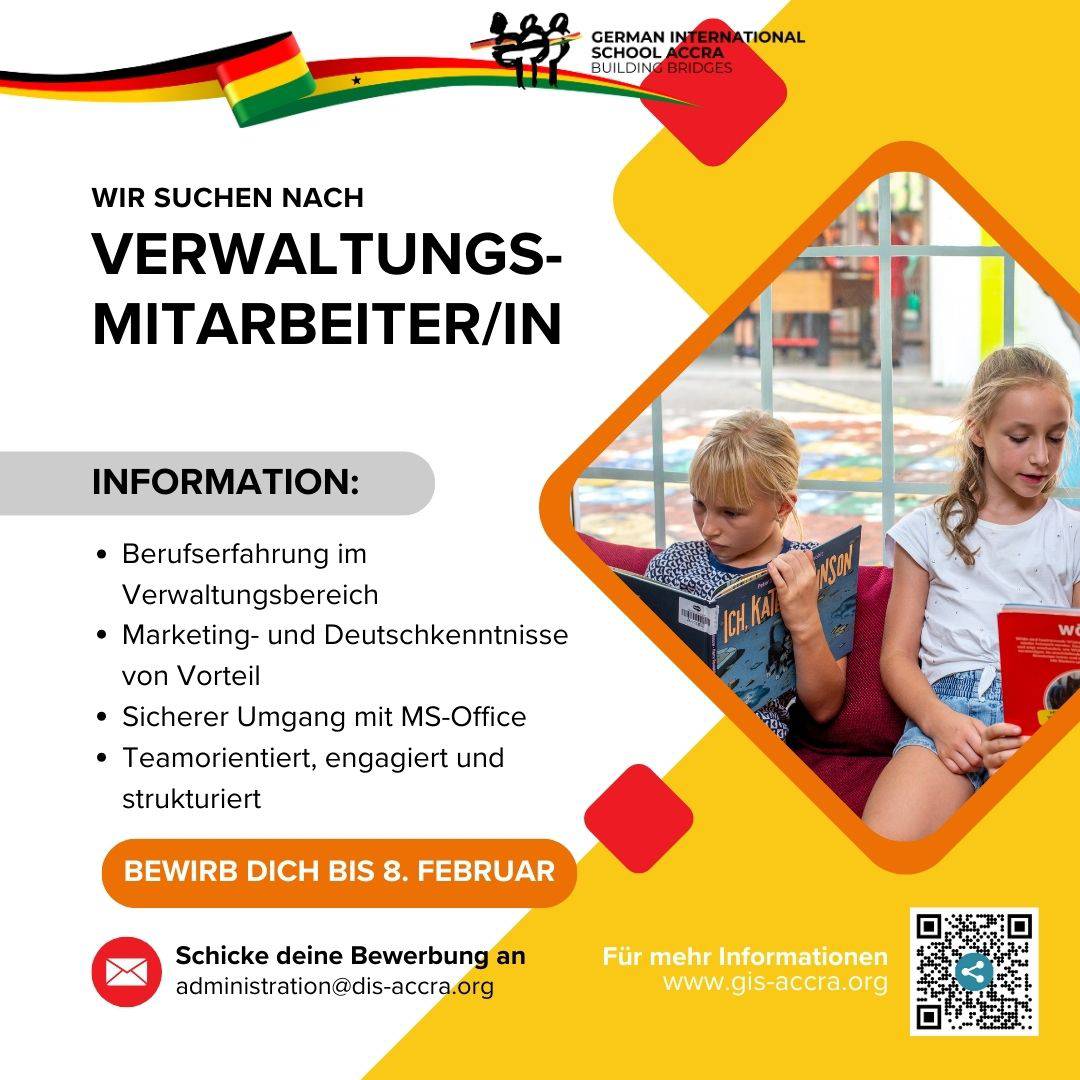 Auf unserem grünen Campus in Accra lernen Kinder und Jugendliche aus unterschiedlichen Nationen gemeinsam, neugierig, respektvoll und mit Freude. Dieses besondere schulische Umfeld lebt von engagierten Persönlichkeiten, die Schule nicht nur als Arbeitsplatz, sondern als Gestaltungsraum verstehen.