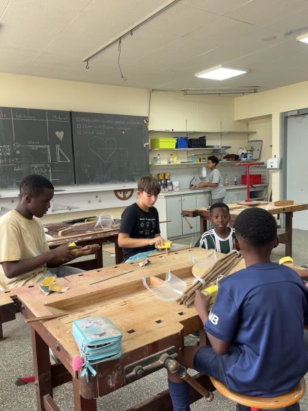 In unserem anfänglichen Erfindungsprozess beginnen wir mit der Schaffung der strukturellen Grundlage durch Holzarbeiten. Die Schülerinnen und Schüler arbeiten fleißig beim Messen und Schneiden der Holzstücke, benutzen Werkzeuge wie Zwingen, Lineale, Sägen und glätten die Oberfläche mit Schleifpapier. Die Atmosphäre der Zusammenarbeit ist sehr produktiv, da die Kinder weiterhin die Techniken diskutieren und sich gegenseitig helfen. Die konzentrierte Mimik der Schülerinnen und Schüler spiegelt die Begeisterung für das Erlernen praktischer Fertigkeiten wider. Sie hoffen, ihr Projekt am 5. Oktober abschließen und ihre Erfindungskreativität präsentieren zu können.