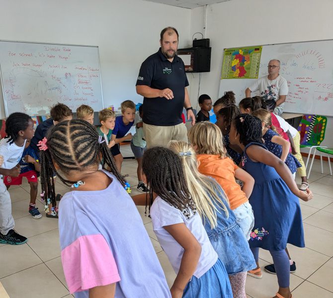 Am Mittwoch genossen unsere Schülerinnen und Schüler einen einstündigen Workshop zum Thema Inklusion und Teilhabe. Unter dem Titel „Football in your Life Parasport Days Ghana" besuchte uns das Team um Björn Nass zum zweiten Mal. Einige Gebärden wurden gelernt, Spiele zum Thema Teamwork und Zusammenarbeit gespielt, Blindenschrift kennengelernt und vieles mehr. Die Kinder hatten Spaß und konnten sich bei unterschiedlichen Aktivitäten ausleben. Wir danken Björn und seinem Team! „Fingers crossed" - Wir hoffen auf einen weiteren spannenden Workshop im nächsten Jahr.