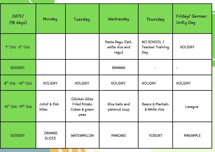Das Ergebnis: Wir bringen frischen Schwung in unser Schulessen! Mehr Abwechslung mit ghanaischen und internationalen Gerichten, die zugleich kindgerecht und gesund sind. Neue Speisen werden zunächst ausprobiert – und die Kinder selbst geben ihr Feedback. Außerdem unterstützt künftig eine Mitarbeiterin des North Ridge Cafés die Essensausgabe, damit die Mittagszeit noch reibungsloser und angenehmer verläuft.