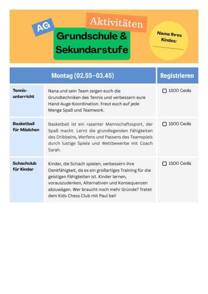 In der ersten Schulwoche dürfen alle Schülerinnen und Schüler die angebotenen AGs kostenfrei ausprobieren, um einen guten Einblick in die verschiedenen Aktivitäten zu erhalten. So fällt die Entscheidung für das passende Nachmittagsprogramm leichter.
