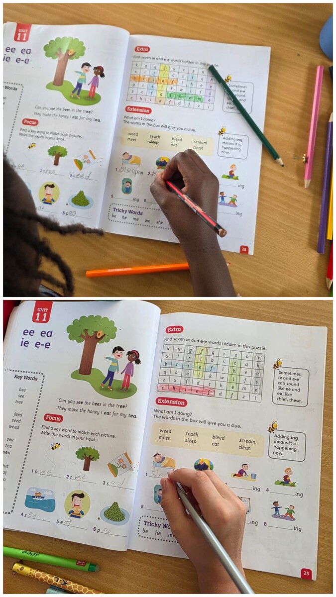 Im Englischunterricht haben wir weiter an der Phonetik gearbeitet und uns besonders mit den Lautverbindungen /ee/, /ea/, /ie/ und /e-e/ beschäftigt. Das Üben dieser Lautmuster hilft den Kindern dabei, ihre Rechtschreibung, ihr Lesen und ihre Aussprache zu verbessern. In Partnerarbeit haben die Kinder wichtige Wörter geübt und außerdem ein Spiel zu zusammengesetzten Nomen gespielt. Mithilfe von Bildern kombinierten sie jeweils zwei Wörter zu einem neuen Begriff. Fragen Sie Ihr Kind gerne zu Hause nach einigen der compound words, die es gelernt hat.