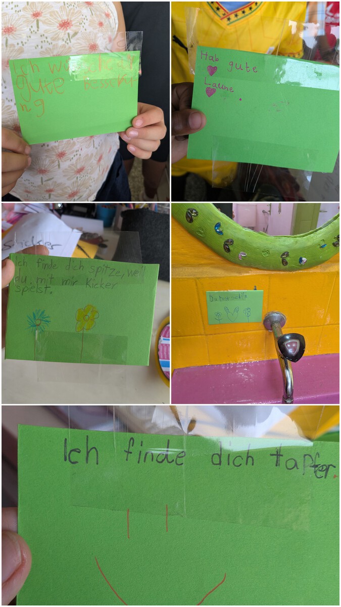 Im Ethikunterricht hat die Klasse darüber gesprochen, dass Komplimente mindestens zwei Menschen glücklich machen: denjenigen, der ein Kompliment macht, und denjenigen, der es erhält. Passend dazu wurden auf dem ganzen Schulgelände freundliche Botschaften versteckt. Vielleicht haben Sie ja schon eine entdeckt?