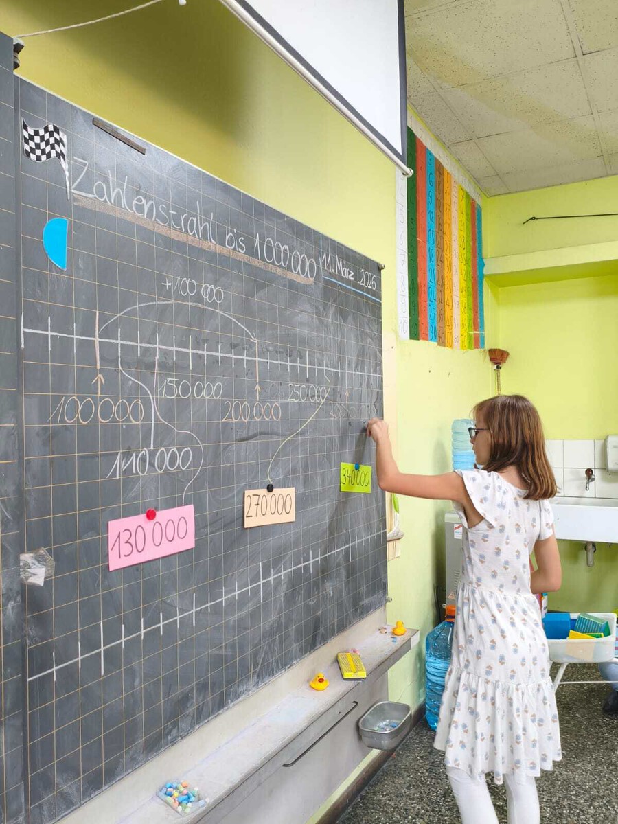 In Mathematik lernten die Schülerinnen und Schüler neue Strategien kennen: Während die 3. Klasse das halbschriftliche Rechnen mit hilfreichen Tricks wie dem Hundertertrick und vorteilhaftem Rechnen übte, startete die 4. Klasse in den Zahlenraum bis 1 Million und arbeitete mit dem Zahlenstrahl.