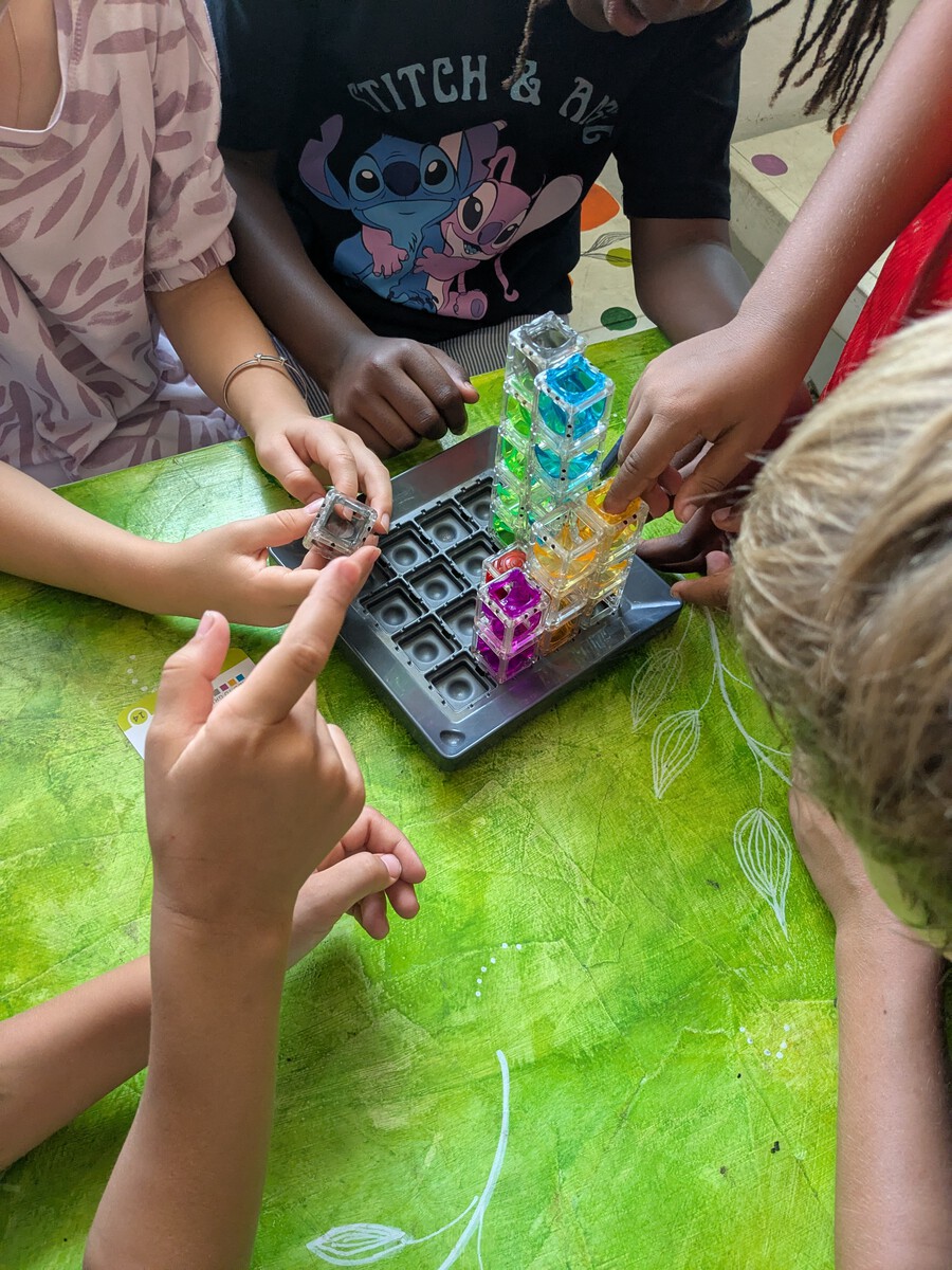 Im Förderband „Stärken stärken“ wurde das Knobelspiel „Gravity Maze“ gespielt. Dabei werden das räumliche Vorstellungsvermögen und die Teamfähigkeit trainiert. Die Kinder überlegen gemeinsam, wie eine Kugel durch geschicktes Einsetzen von Bauteilen an einen vorgegebenen Ort gelangt und wie sie unterschiedliche Ideen im Team abstimmen können.