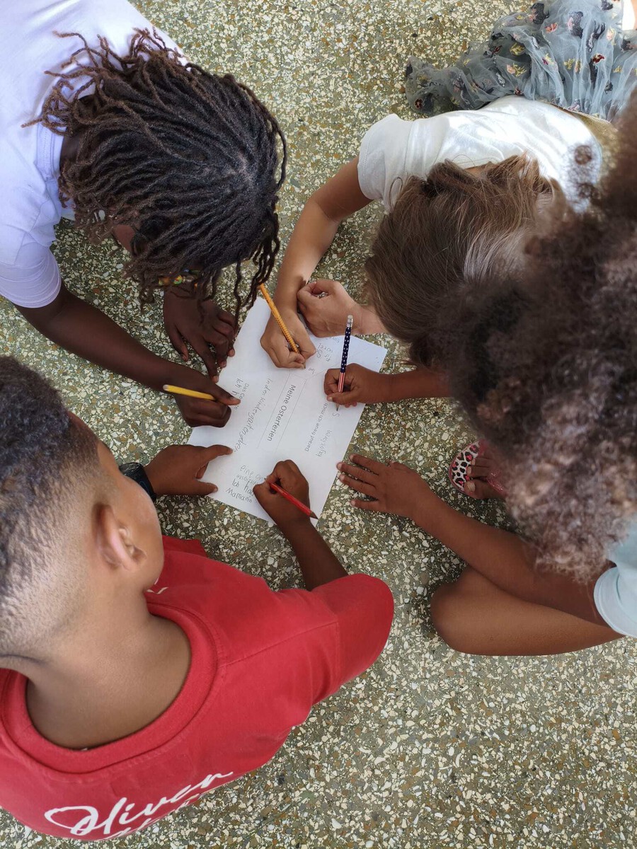 Auch die Placemat-Methode kam wieder zum Einsatz, um nach den Ferien gemeinsam anzukommen. Dabei haben die Kinder zu Fragen wie „Ein schöner Ort“, „Was war witzig?“, „Was war das Coolste?“ und „Worauf freust du dich wieder in der Schule?“ gearbeitet. Das Blatt wurde von vier Seiten gleichzeitig ausgefüllt und nach kurzer Zeit weitergedreht, bis alle Kinder zu jeder Frage etwas beitragen konnten.