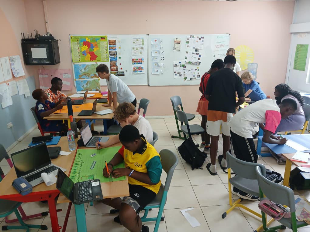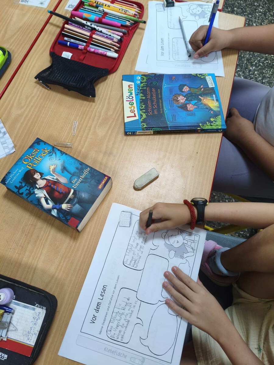 Auch im gemeinsamen Deutschunterricht (DaM und DaF) wurde intensiv gearbeitet: Für das GISA-Jahrbuch wurden Ideen gesammelt. Beim Durchsehen der Jahrbücher der vergangenen Jahre entdeckten die Schülerinnen und Schüler viele spannende, lustige und überraschende Inhalte. Anschließend blickten sie gemeinsam auf die vergangenen Monate zurück und sammelten zahlreiche Erlebnisse – von großen Events bis hin zu kleinen Alltagsmomenten.
