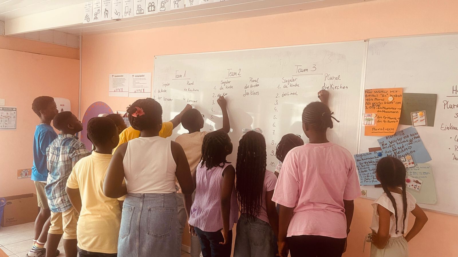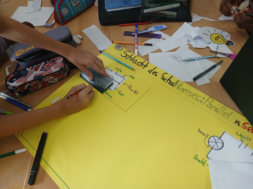 Die DaF-Intensivklasse hat in dieser Woche in Lektion 6 zum Thema Schulmaterialien weitergearbeitet. Die motivierten Lernenden aus der Grund- und Sekundarstufe erarbeiteten sich in sechs Gruppen die Kategorien der deutschen Pluralbildung sowie passende Lernstrategien. Anschließend präsentierten die Gruppen ihre Ergebnisse und erklärten diese ihren Mitschülerinnen und Mitschülern.