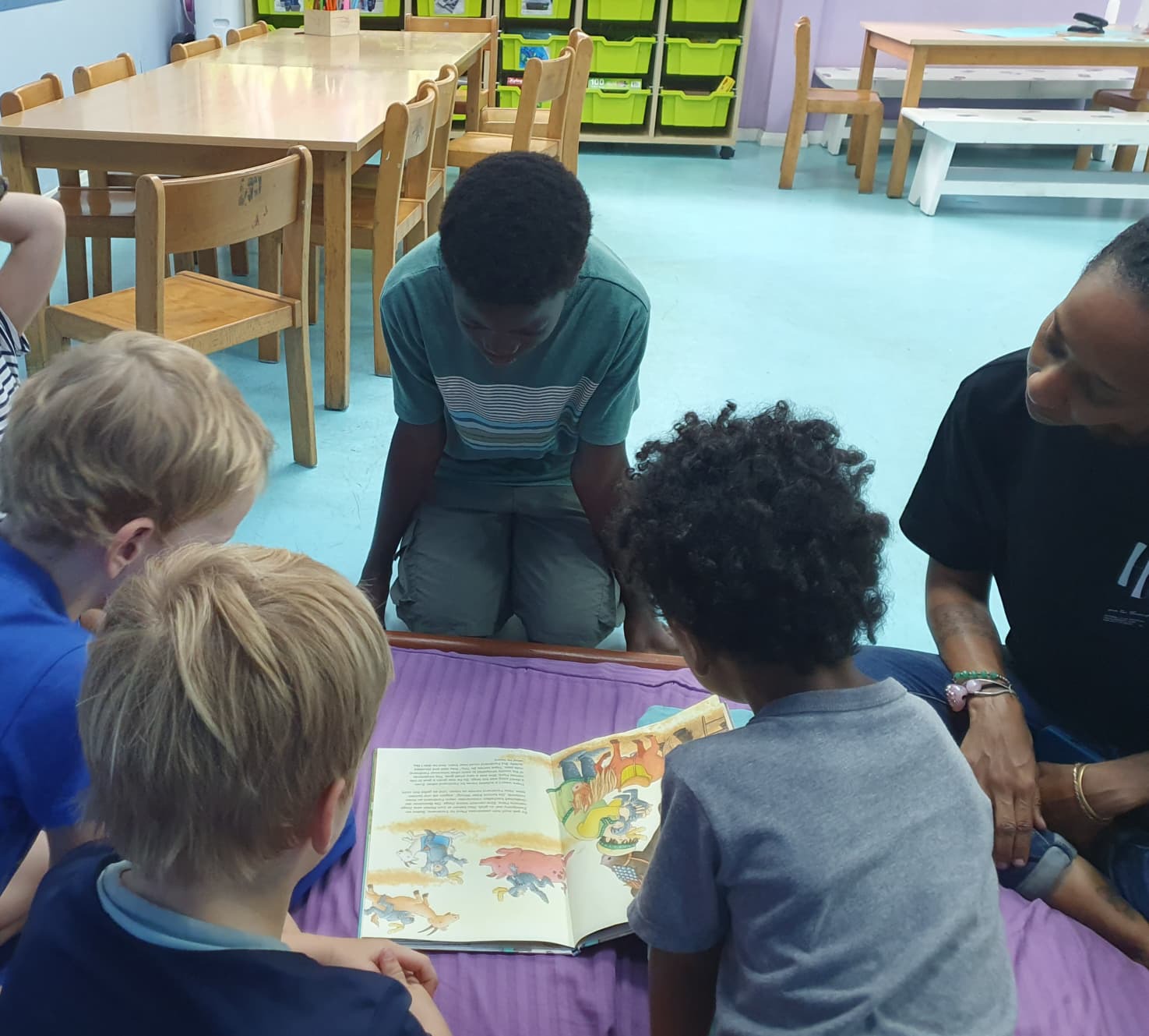 Ein besonderes Highlight war der Einsatz der Lernenden der Sekundarstufe, die am Freitag ihre Lesekompetenz unter Beweis stellten, indem sie den Kindergartenkindern auf Deutsch vorlasen – eine Aufgabe, die sie zur großen Freude der Kinder sehr gut meisterten.