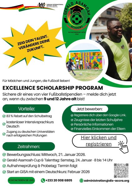 Die Deutsche Internationale Schule Accra (GISA) startet am 24. Januar 2026 erstmals den Gerald-Asamoah-Cup – eine einzigartige Bühne für junge Talente, um sich für ein Stipendium zu qualifizieren.