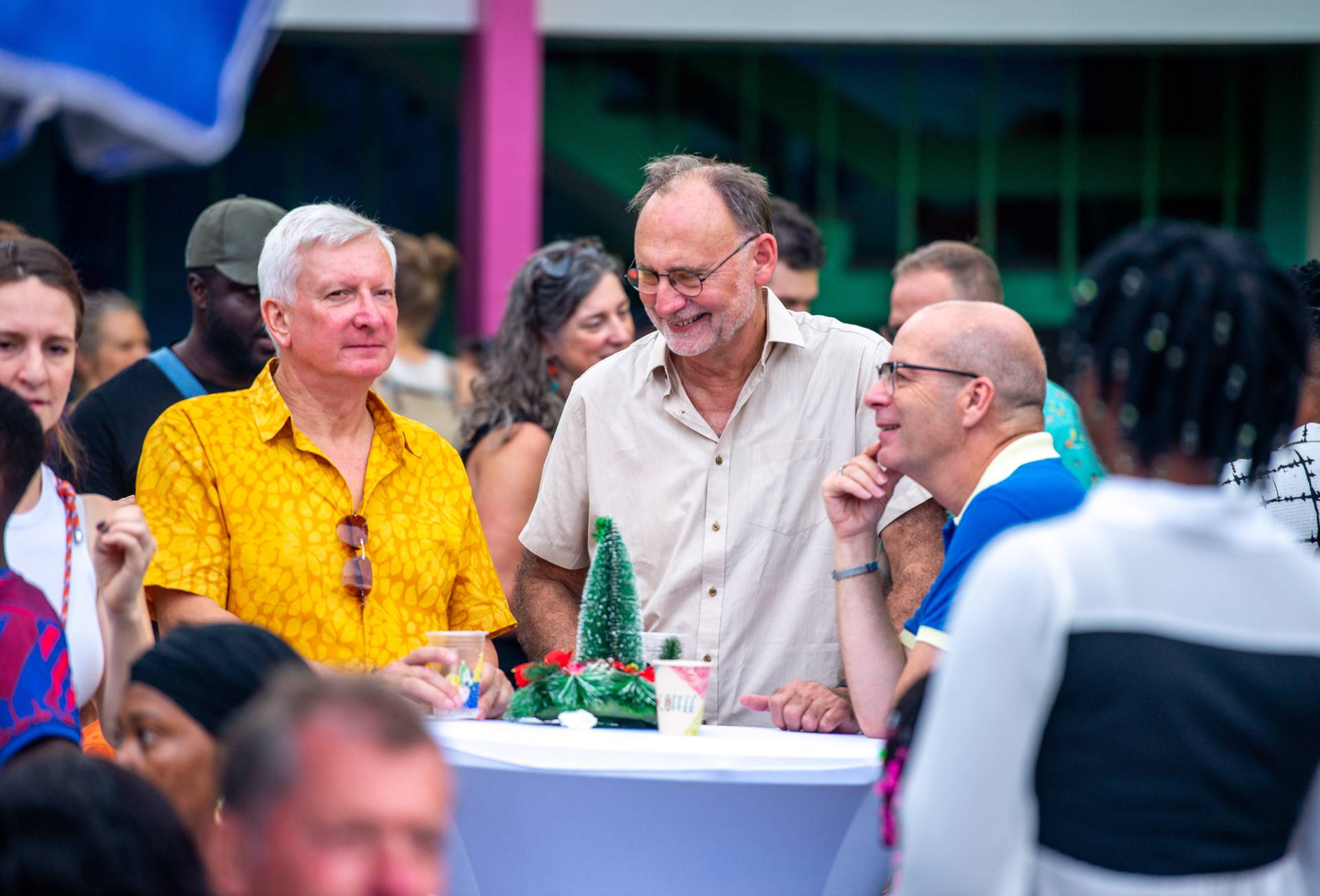 Zwischen 16:00 und 17:00 Uhr hatten wir vor dem Swiss Club Besuch von Dieter Sehburger und Christoph Roller, die am Vortag in Accra angekommen waren. Die beiden – samt ihrer Fahrräder – befinden sich auf ihrer Peace Bike Tour von Deutschland und der Schweiz bis nach Madagaskar und sammeln unter dem Motto „give me 30 seconds“ Stimmen und Gedanken zum Thema Frieden. Ihre kurze Station bei uns bot interessante Impulse und ergänzte den Weihnachtsmarkt um eine internationale Perspektive – ein schöner Baustein im Gesamtprogramm.