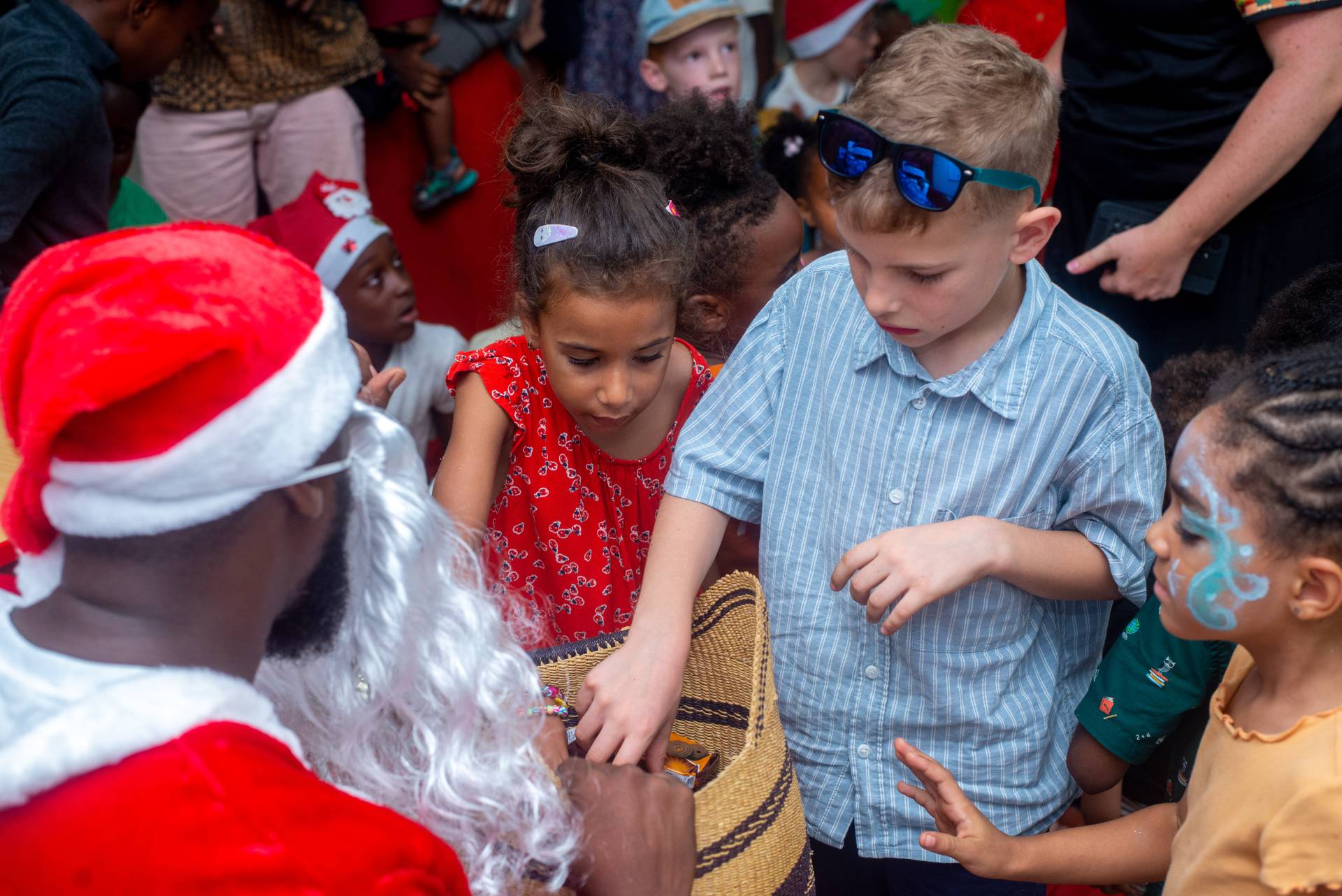 Über 40 Verkaufs- und Essensstände boten alles, was das Herz begehrt: handgemachte Geschenkideen, internationale Köstlichkeiten, kreative Kunstobjekte – und selbstverständlich durfte auch ein Glühweinstand nicht fehlen. Zahlreiche Besucherinnen und Besucher aus aller Herren Länder füllten den Campus mit einem fröhlichen Stimmen- und Sprachengewirr – im besten Sinne eines interkulturellen Come-togethers. An manchen Ständen war zeitweise kaum noch ein Durchkommen, so groß war der Andrang und die Begeisterung. Dazu kamen vielfältige Mitmachangebote. Engagierte Mitarbeiterinnen und Mitarbeiter aus Kita und Schule – oft unterstützt durch fleißige Schülerinnen und Schüler – boten zahlreiche Aktivitäten an, darunter Kinderschminken, Spiele, eine Kegelbahn, sportliche Parcours, Armbänder- und Adventskalender-Basteln sowie originelle Fotoaccessoires. Ein besonderes Highlight war die humorvolle Mockumentary zur Heiligen Nacht in Bethlehem – ein kreatives Projekt aus der Sekundarstufe.