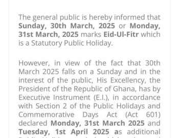 Das Innenministerium Ghanas hat die Öffentlichkeit darüber informiert, dass Montag, 31.03.2025 und Dienstag, 01.04.2025 öffentliche Feiertage sind. Somit sind beide Tage unterrichtsfrei.
