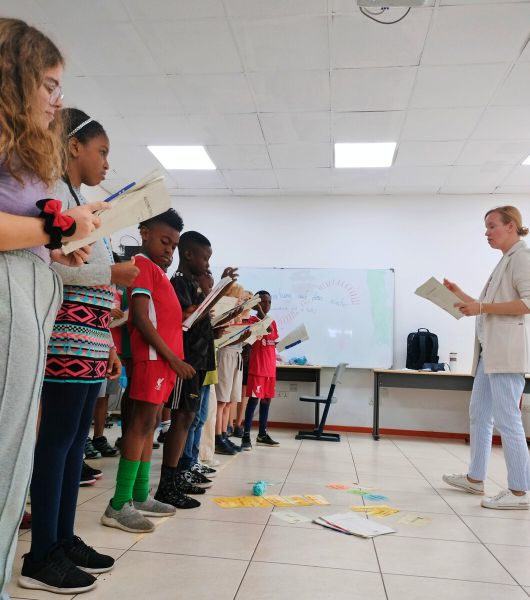 On 23.08.2024, Prof. Dr. Winnie-Karen Giera and student assistant Lilly Woltersdorf from Inclusive German Didactics visited the German International School in Accra (Ghana). The 6th and 7th graders joined them in a theater workshop with a youth text on the topic of bullying. After a few warm-up exercises for the drama, they started practising the text. The reading training led to a read-aloud play.