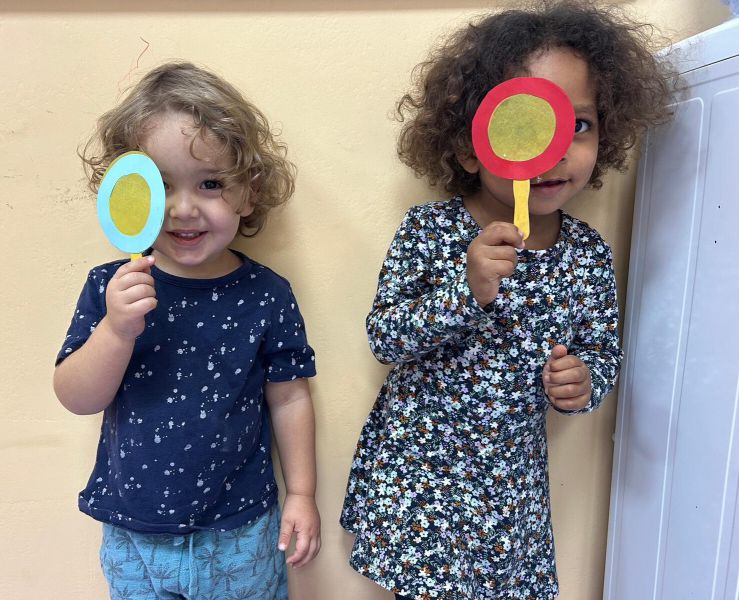 The highlight of the week in our nursery was making colored magnifying glasses. With great enthusiasm and creativity, the children made colorful magnifying glasses out of transparent paper and sturdy, colorful frames.