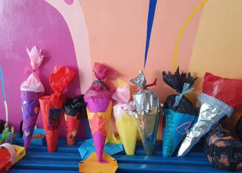 The DaF class at secondary level (the motivated pupils in years 5, 6 and 7) got to grips with the German tradition of school cones before the vacations. They each made one as a welcome gift for the new students starting in May. The results were varied and colorful.This week, our topic was the vocabulary of the circle of friends, school, lessons, but also nutrition and the food pyramid.With the topic of school and lessons, the learners have dealt with the polite form, negation and possessive articles in grammar.This Friday, the DaF group once again wrote a learning objectives test on this week's topics.What the learners also prepared this week were profiles for future collaboration with students from the University of Potsdam. Next week, the students will receive letters of introduction from Potsdam and prepare for their future interview acquaintances.