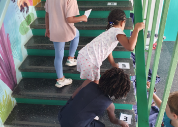 Den Zahlenraum von 1 bis 10 begehen, ersteigen, durchhüpfen und erleben. Dabei auch die Zuordnung von Menge und Ziffer festigen, das sind die Ziele in diesem Förderband von Benjamin Akrong.