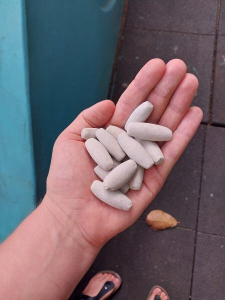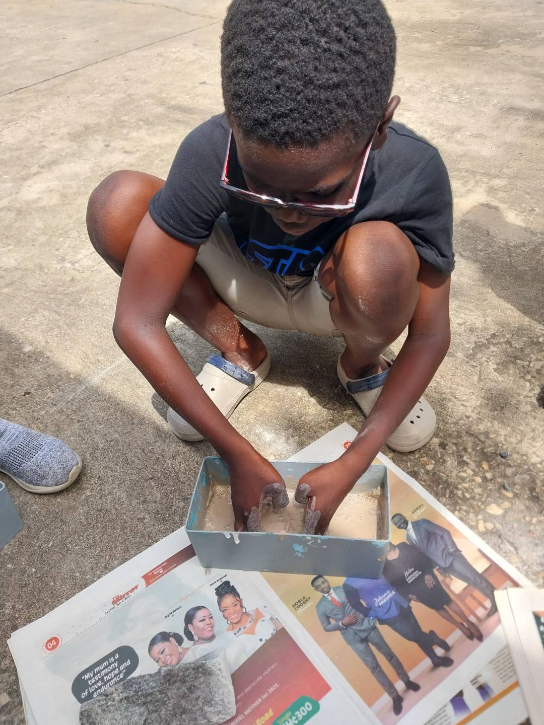 Trockene lokale Ton-Röllchen, lokal bekannt unter dem Namen „Hyile“, mussten mit Steinen zu feinem Pulver zermahlen werden. Anschließend, mit ein bisschen Wasser vermischt, ergab dies modellierbaren Ton. Das richtige Verhältnis von Pulver und Wasser war entscheidend und wurde von den Kindern durch Ausprobieren erforscht.