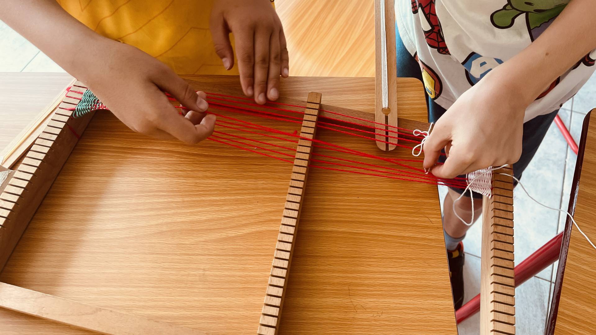 Catherine erklärte den Kindern, dass man die Kettfäden des Webrahmens immer in einer geraden Anzahl einspannen sollte – sonst gerät das Muster leicht durcheinander. Ein Aha-Moment für viele, denn hier wurde sofort klar: Ohne ein bisschen Mathe geht es beim Weben nicht!