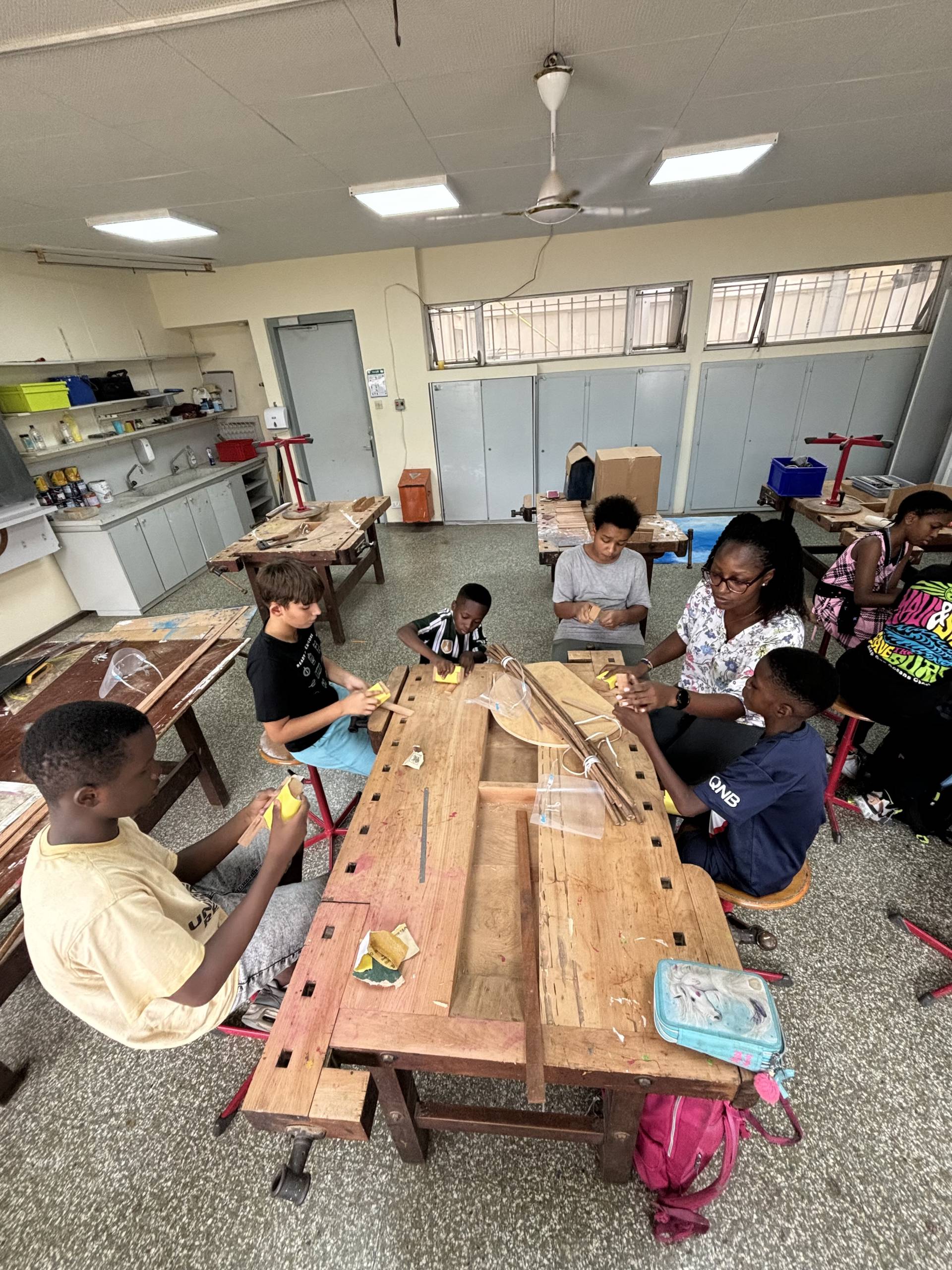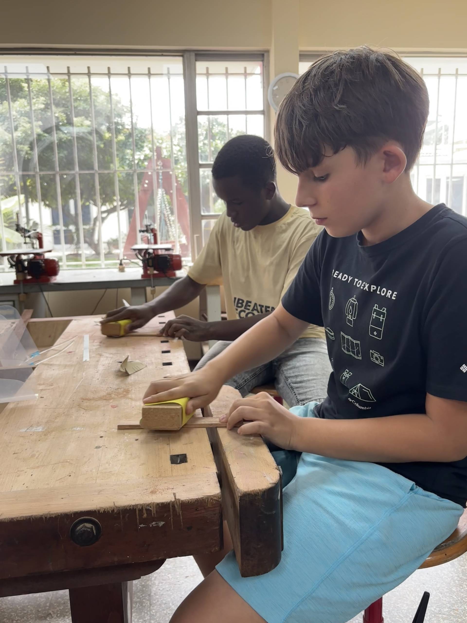 In unserem anfänglichen Erfindungsprozess beginnen wir mit der Schaffung der strukturellen Grundlage durch Holzarbeiten. Die Schülerinnen und Schüler arbeiten fleißig beim Messen und Schneiden der Holzstücke, benutzen Werkzeuge wie Zwingen, Lineale, Sägen und glätten die Oberfläche mit Schleifpapier. Die Atmosphäre der Zusammenarbeit ist sehr produktiv, da die Kinder weiterhin die Techniken diskutieren und sich gegenseitig helfen. Die konzentrierte Mimik der Schülerinnen und Schüler spiegelt die Begeisterung für das Erlernen praktischer Fertigkeiten wider. Sie hoffen, ihr Projekt am 5. Oktober abschließen und ihre Erfindungskreativität präsentieren zu können.