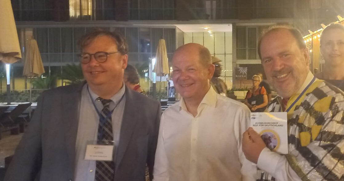 Der Vorsitzende des Schulvorstands Martin Wilde und Schulleiter Rainer Kropp-Kurta stellten Bundeskanzler Olaf Scholz das innovative Projekt für einen Brückenbau von Ghana in die deutsche duale Ausbildung vor.