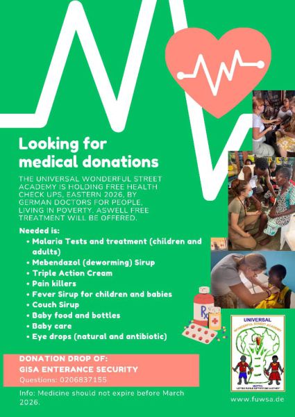 Um diese Gesundheitschecks gut vorbereiten zu können, werden ab Montag, dem 12.01., medizinische Sachspenden gesammelt. Jede Unterstützung hilft dabei, die Versorgung vor Ort sinnvoll zu ergänzen und Kindern wie Erwachsenen ein Stück mehr Sicherheit und Fürsorge zu ermöglichen.