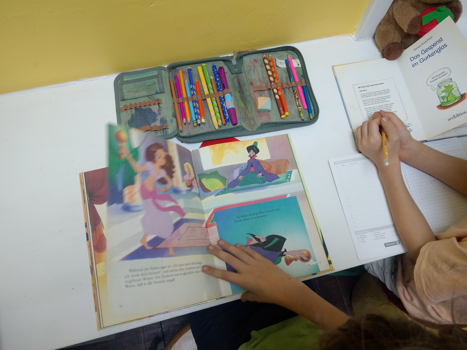 Auch im Deutschunterricht stand das Geschichtenschreiben im Mittelpunkt. Ausgehend von verschiedenen Bildimpulsen sammelten wir in kleinen Gruppen zahlreiche Ideen zu den wichtigen Fragen Wer? Wo? Wann? Was? Auf dieser Grundlage entstanden eigene Geschichten, die anschließend vor der Klasse vorgelesen wurden. Dabei war es uns besonders wichtig, interessiert zuzuhören, nachzufragen und den Autorinnen und Autoren konstruktive Rückmeldungen zu geben.