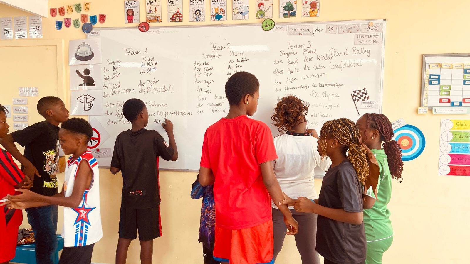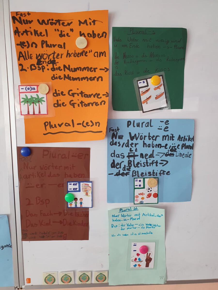Die DaF-Intensivklasse hat in dieser Woche in Lektion 6 zum Thema Schulmaterialien weitergearbeitet. Die motivierten Lernenden aus der Grund- und Sekundarstufe erarbeiteten sich in sechs Gruppen die Kategorien der deutschen Pluralbildung sowie passende Lernstrategien. Anschließend präsentierten die Gruppen ihre Ergebnisse und erklärten diese ihren Mitschülerinnen und Mitschülern.