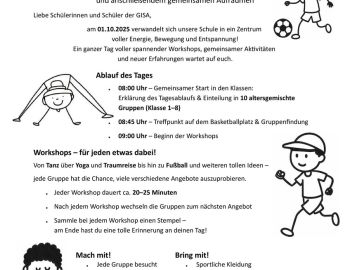 Am Mittwoch, den 01. Oktober 2025, hat sich unsere GISA unter dem Motto „Gemeinsam bewegen, gemeinsam entspannen, gemeinsam erleben!“ in einen lebendigen Ort voller Energie, Kreativität und wohltuender Ruheinseln verwandelt. Beim ersten „Tag der Bew…
